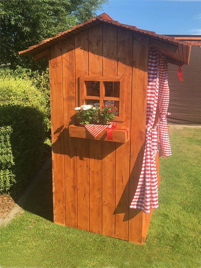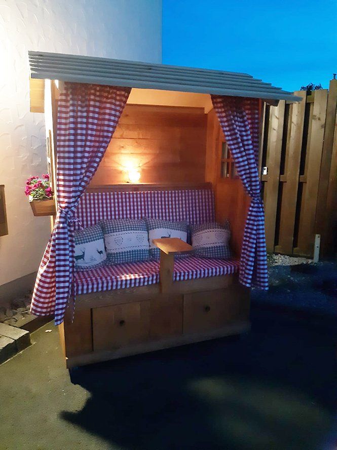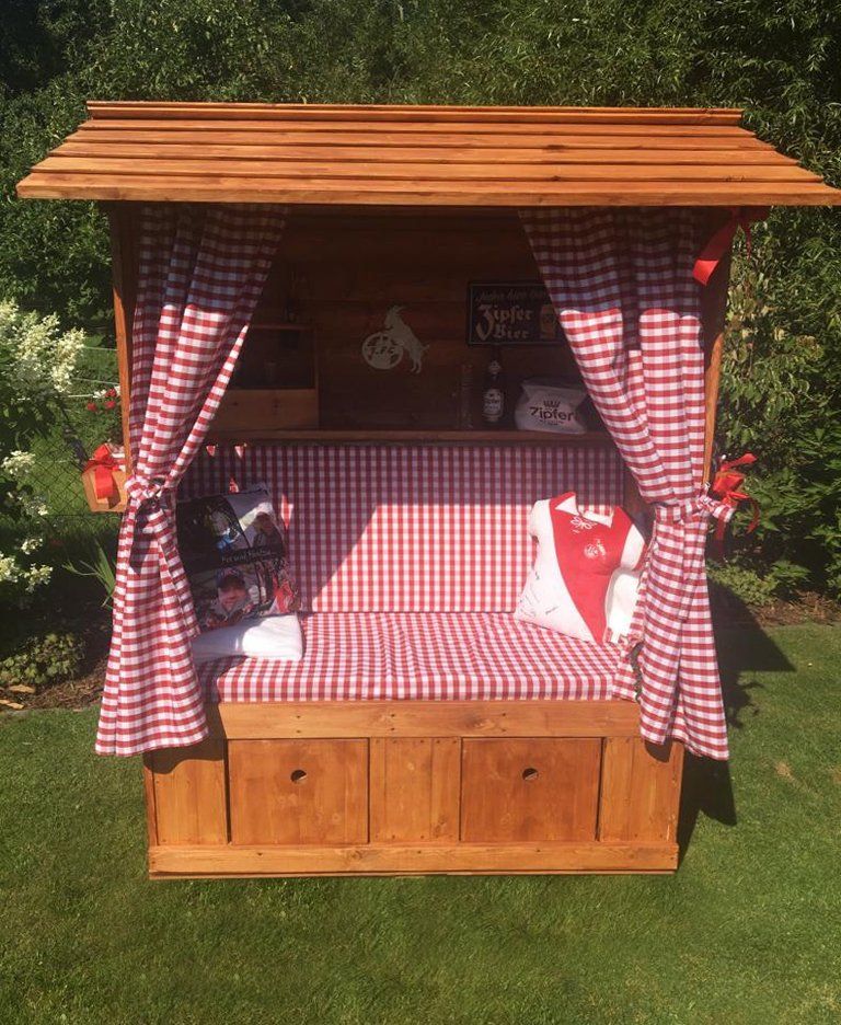 Wer seine Pausenbutze ganz individuell ausstatten möchte, bestellt Gardinen, einen Tisch zum Ausstecken und Polster für die Fußstützen. Natürlich kann man die Butze in Holz-Natur belassen, sie gern aber auch anstreichen lassen. Zum Beispiel in der Trendfarbe Grau. Auch die Gardinen gibt es in mehreren Varianten: Es gibt sie ebenfalls im modischen Grau oder kariert in rot-weiß, grün-weiß für ein rustikal-gemütliches Ambiente.